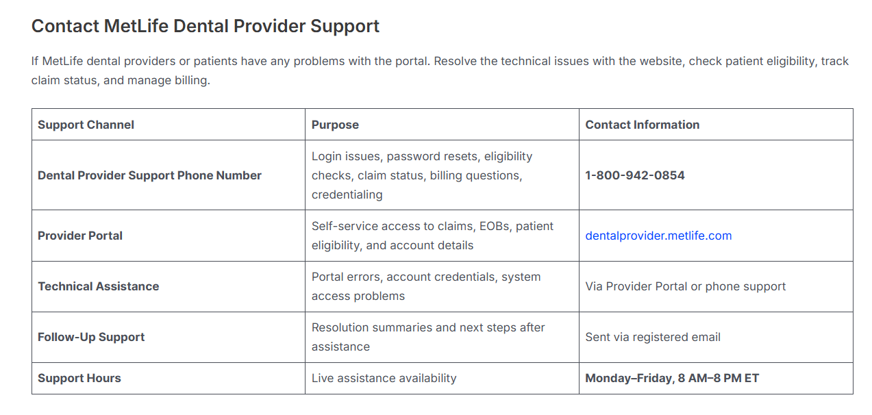 If you need official assistance with dental provider services, claims, or account-related questions for the MetLife Dental Provider Portal, you can contact the support team using the details below: